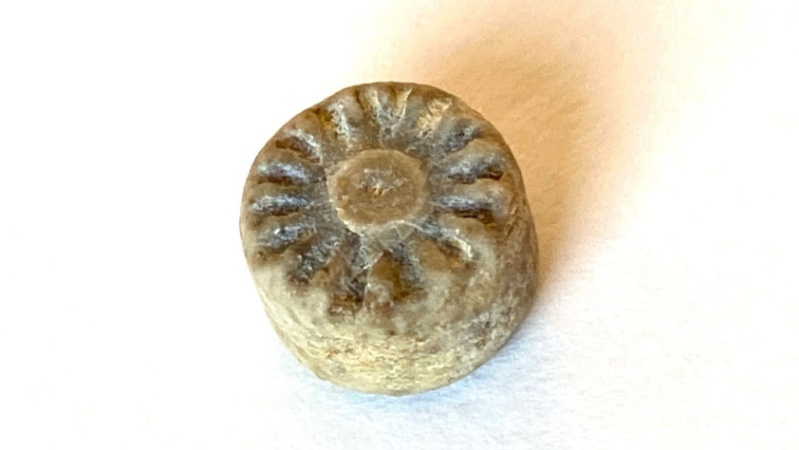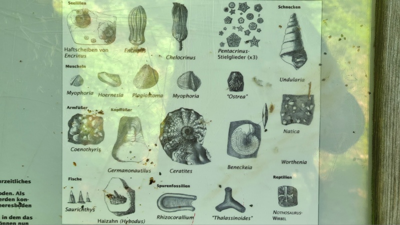 Auf sehr guten Schautafeln gibt es Informationen über die hier vorkommenden Fossilien. - Wir finden Muscheln, Seelilien und Teile eines Ammoniten. Und als wir die schönen Stilglieder der Seelilie näher anschauen, verstehen wir, warum die alten Germanen diese „Trochiten“ als „Sonnenradsteine“ und kultisches Symbol der Sonne verehrten. Mehr infos dazu in unserem Buch Schätze finden.